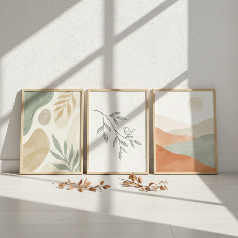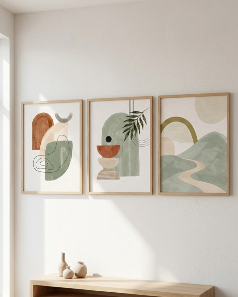 Sets often work best when the prints share a similar colour palette. For example, a trio of neutral abstracts or organic shapes can feel cohesive and calming. Keeping the frames simple also helps maintain the minimalist aesthetic.