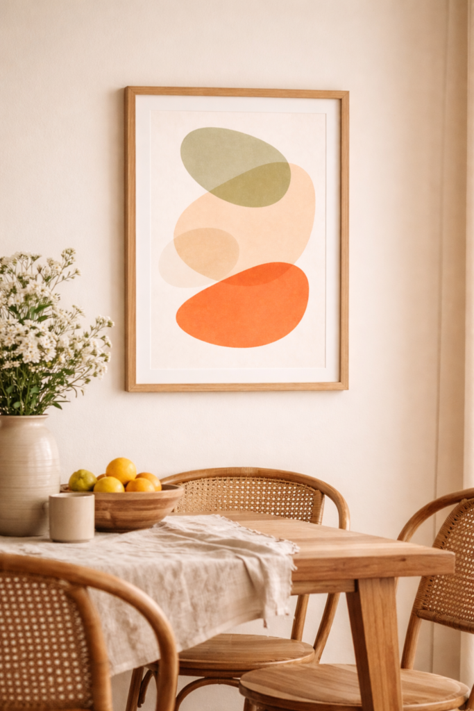 Japandi design often focuses on nature and organic materials, so artwork that echoes those shapes fits naturally into the space. These pieces feel calm and grounded, especially when paired with wooden frames or light oak furniture.