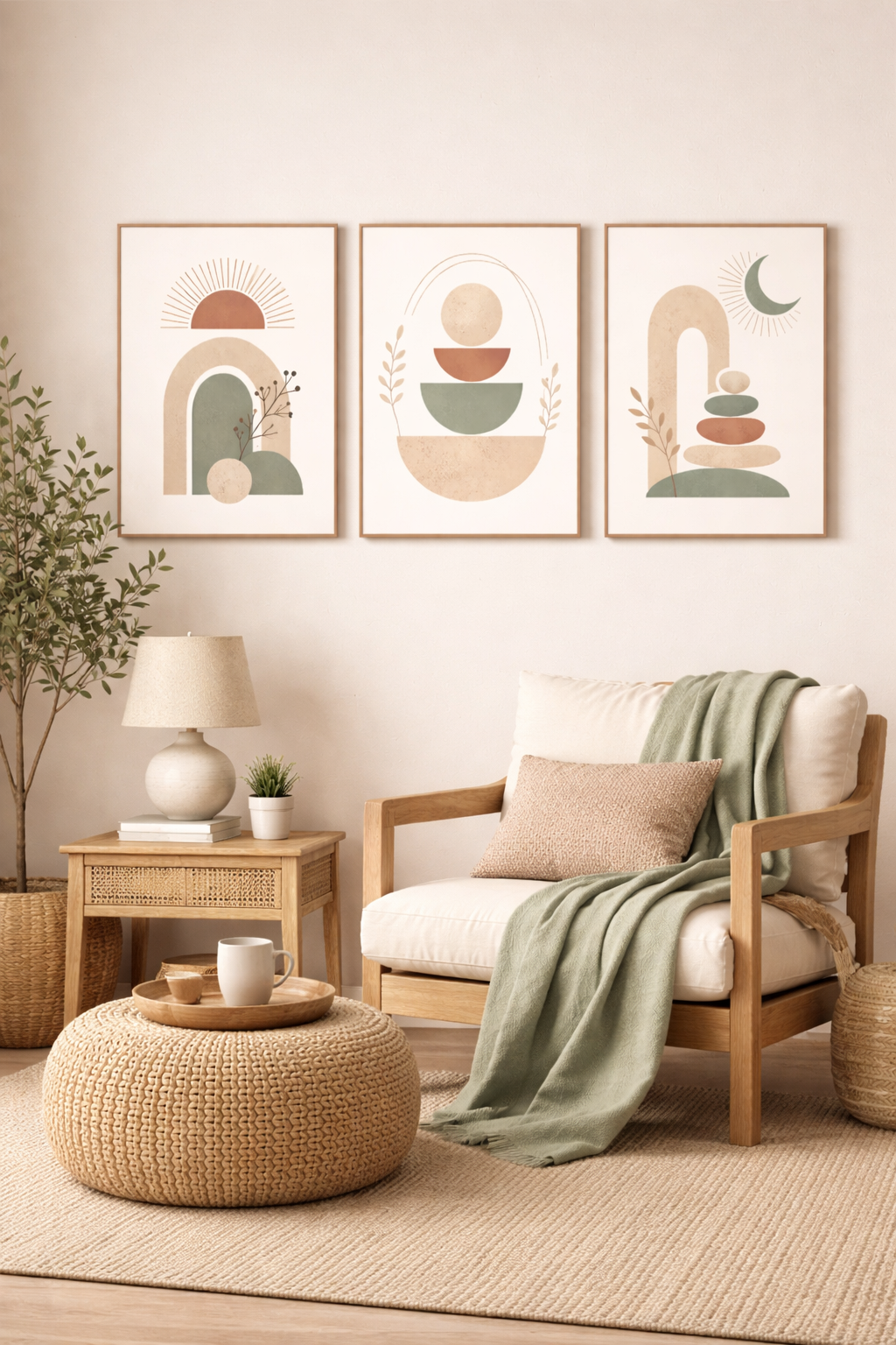 When arranging wall art in a Japandi room, less is usually more. One large print or a balanced set of two or three pieces often feels more intentional than filling a wall with many small frames.