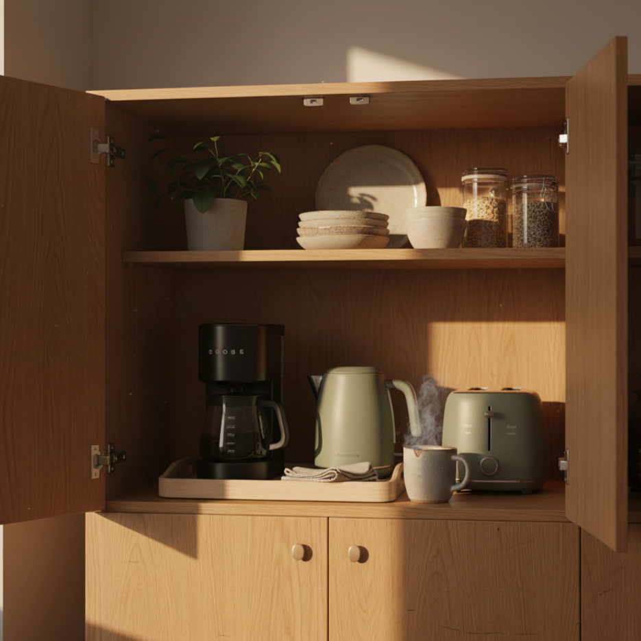Instead of scanning the whole room for the coffee, the spoons, and the bread, your brain knows exactly where to focus. The cupboard acts as a “reset button.” You make your mess, you enjoy your meal, and then—with one flick of the wrist—the mess ceases to exist.
