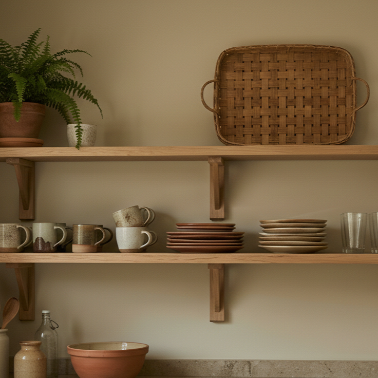 The things we use constantly — drinking glasses, cups, plates, trays — live on the open shelves. They’re fairly simple pieces: neutral ceramic mugs, drinking glasses, everyday plates, a wooden tray. Not because they’re meant to be displayed, but because they’re easy to grab, easy to wash, and easy to put back in the same spot every time. When shelves work like this, they stay tidy almost without effort. And best of all, they don’t have time to gather dust.