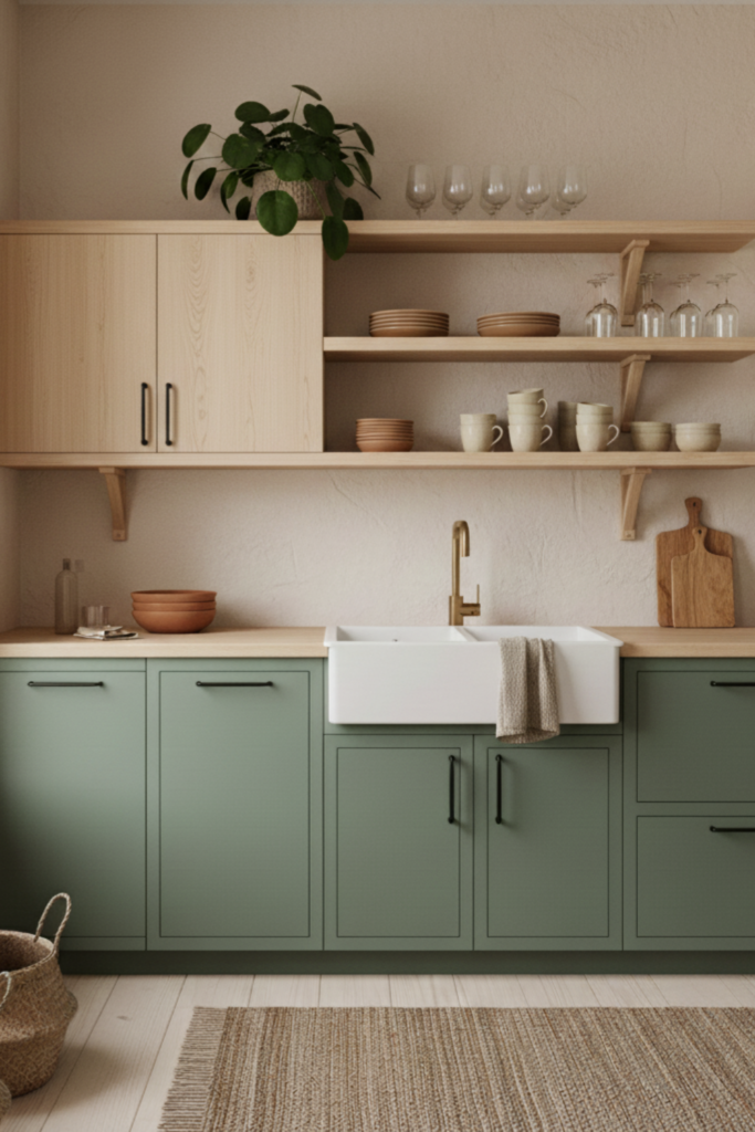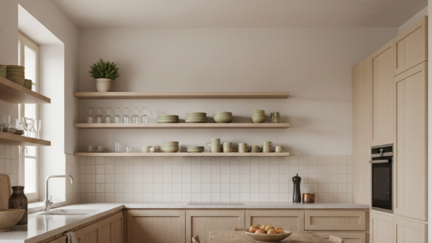 Open shelving works best when it’s not everywhere. A few shelves give the eye somewhere to land. Too many, and the room starts to feel unfinished or demanding. Calm kitchens seem to understand this instinctively — they offer just enough openness to feel alive, and just enough closure to feel restful.