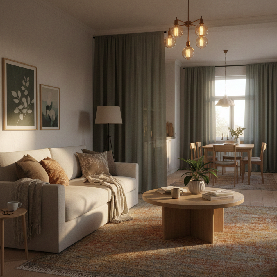 Once we added a few clearer boundaries — nothing dramatic, just a little open shelf with plants to divide the living room and the dining room — evenings felt quieter somehow.