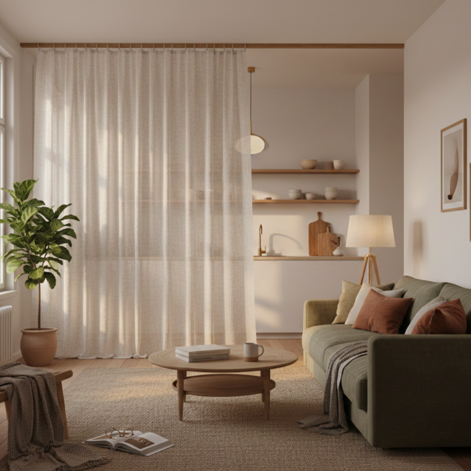 Fabric can do something similar. A light curtain, used away from windows, can close off a workspace or dining area in the evening without turning it into a separate room. Drawn at night and opened again in the morning, a simple linen curtain becomes less of a design feature and more of a signal that part of the day has ended.