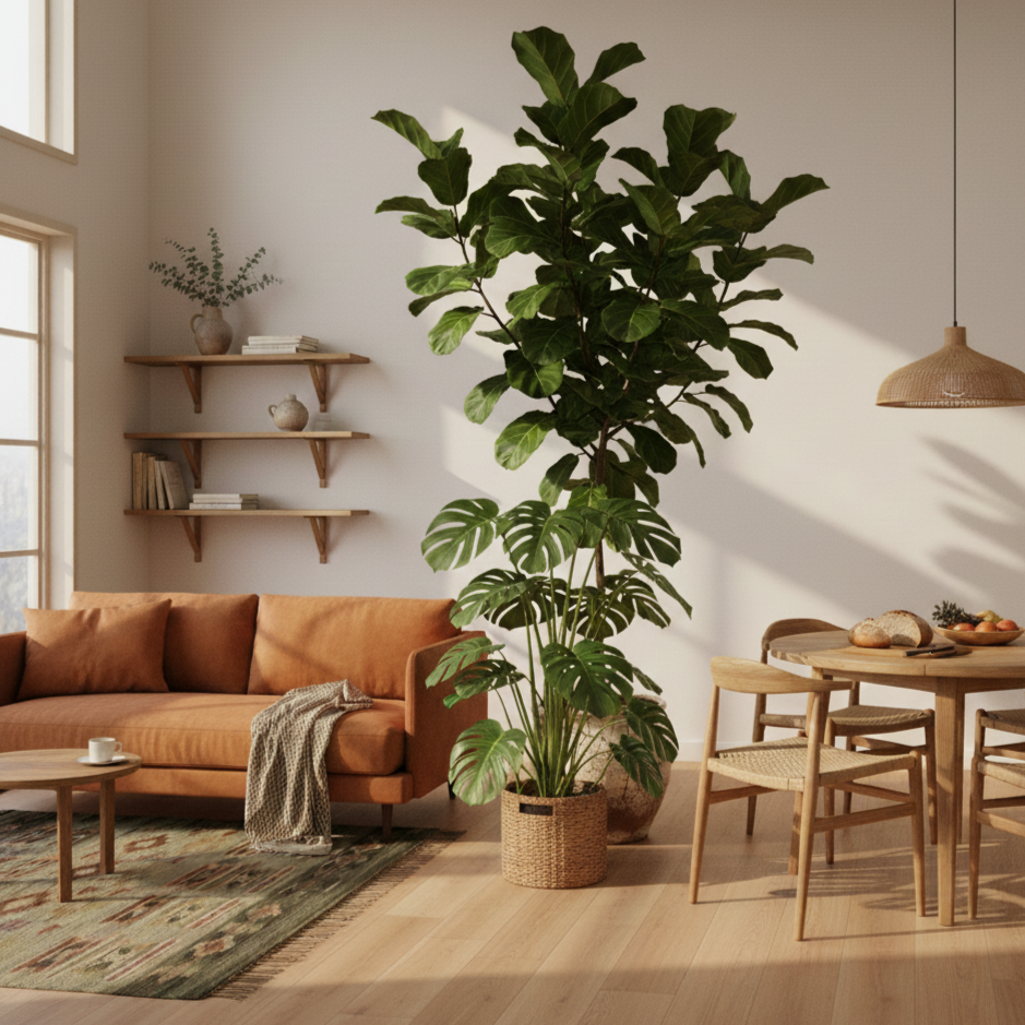 Even plants can function this way when they’re placed deliberately. A tall plant between two zones doesn’t just add greenery — it breaks a sightline. It gives the eye somewhere to stop, which is often all that’s needed for a room to feel quieter.