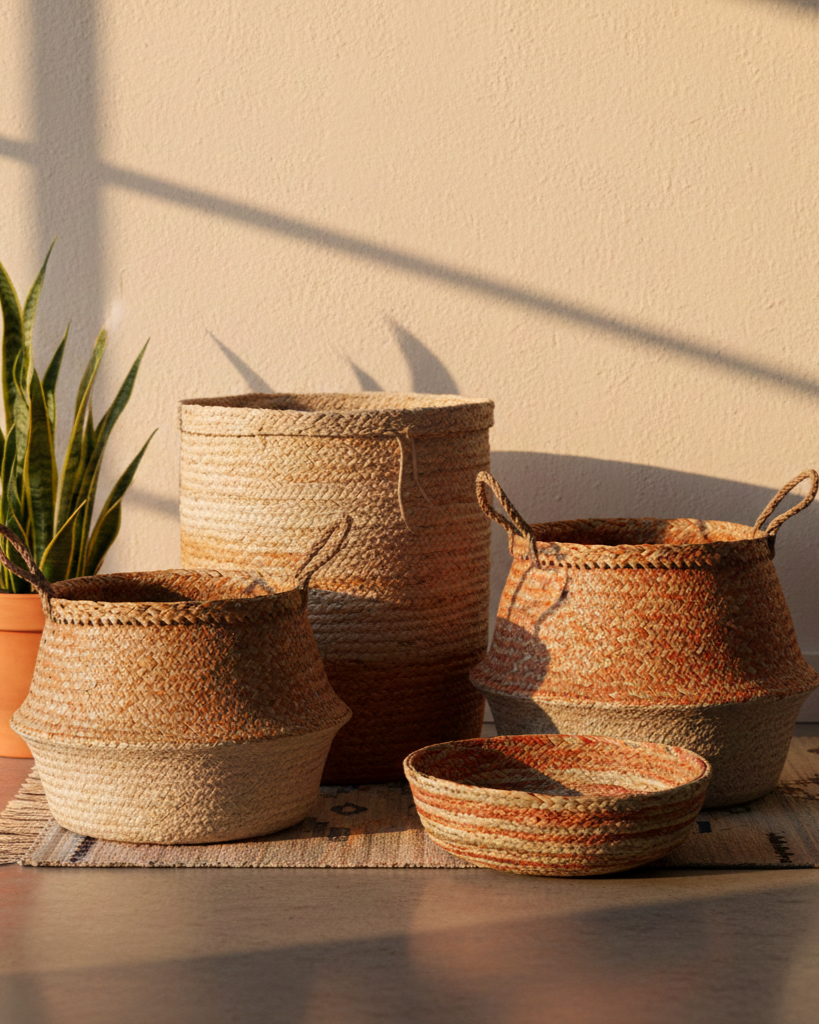 A set of handwoven storage baskets works best when they’re used openly — not hidden away — because they contribute to the room’s texture even when they’re just sitting there.
