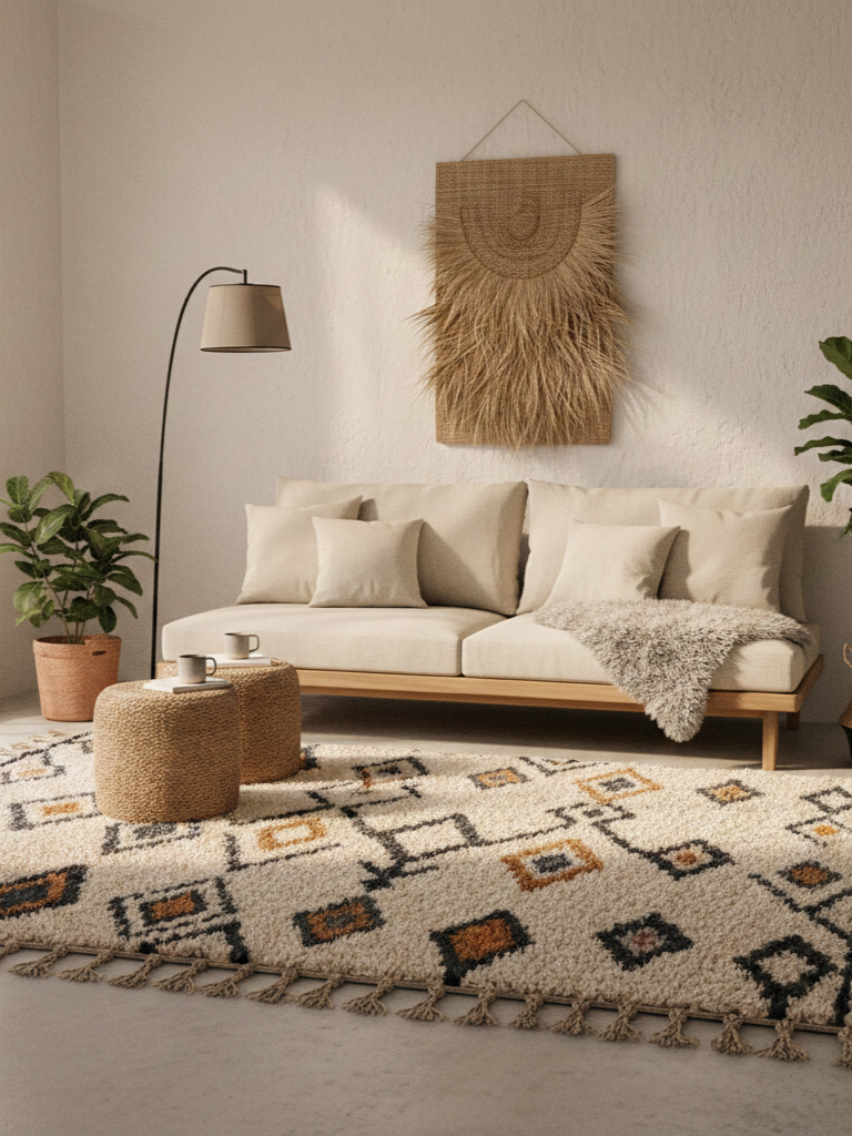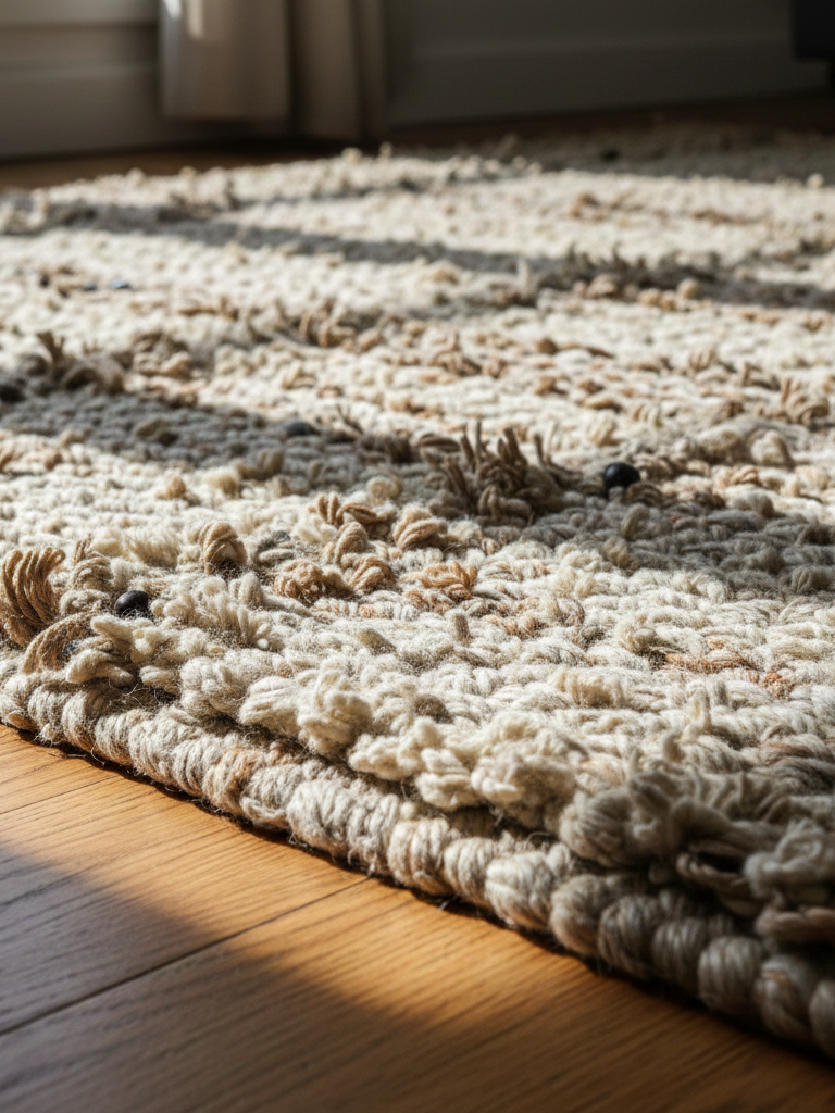 A thick woven area rug in natural fibers fits naturally here — not as a statement piece, but as something that allows the room to relax.