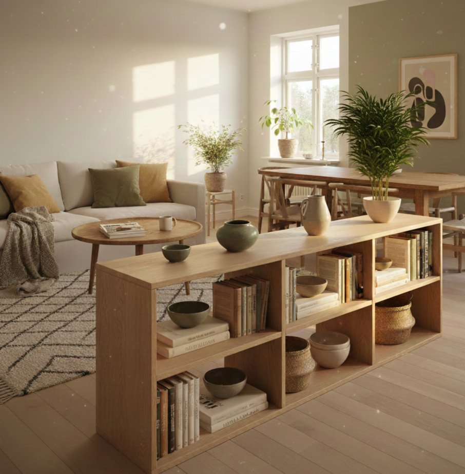 A low divider, shelving unit, or screen — something like a slim open shelf ora woven room divider — doesn’t block light, but it gently signals where one space ends and another begins.