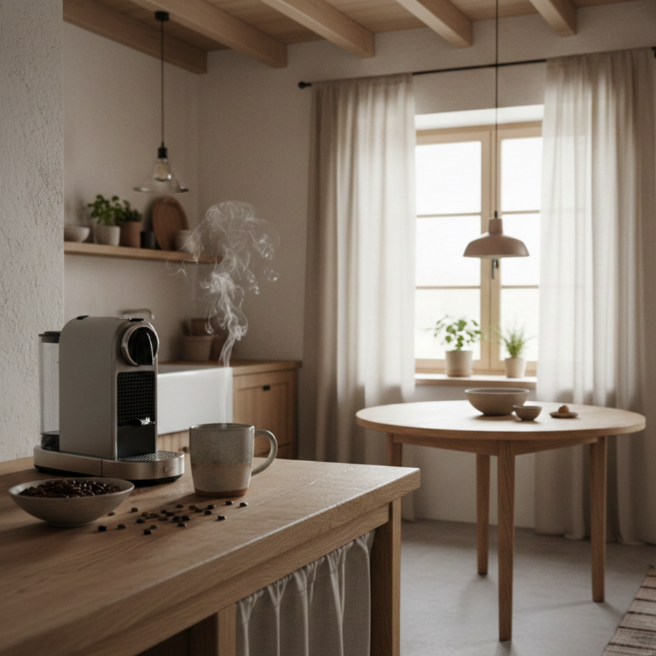 The coffee is brewing, which buys a few minutes. That short wait matters more than I used to think. A quiet coffee machine in the morning doesn’t just make coffee — it sets the volume for everything else that follows. When the sound stays soft, the rest of the kitchen feels easier to move through, even when a few things are happening at once.